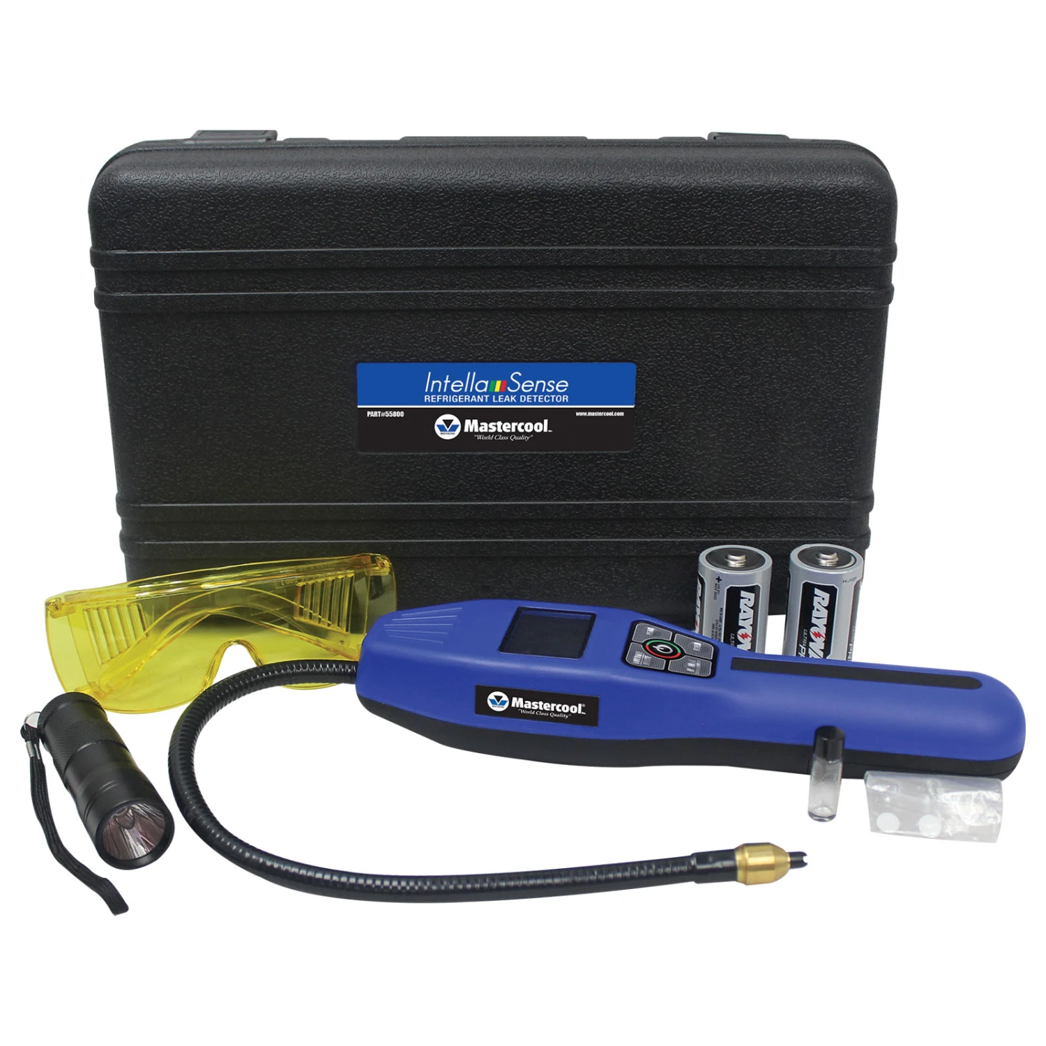 Référence 55850 qui comprend : Détecteur de fuites Intella Sense Mastercool 55800, Lampe UV à 12 LED (UV-53512), Lunettes de sécurité UV (92398), 2 piles «D», Filtres de rechange (55800-FILTER), Test de fuite Vial (55800-VL), Coffre moulé (55800-PB)