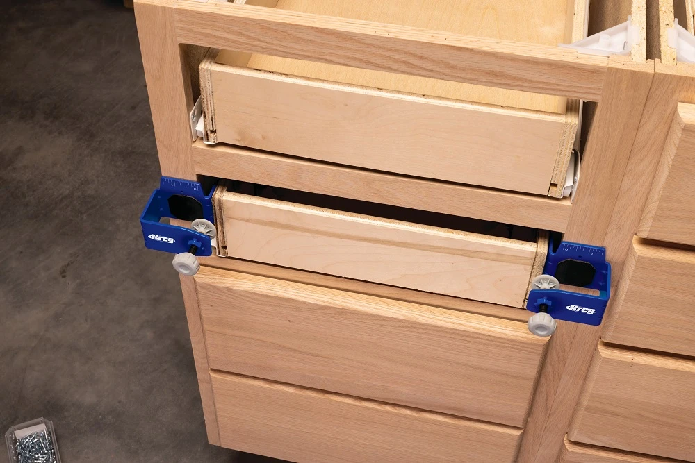 Le kit d’outils de montage de façade de tiroir réduit le nombre de repositionnements nécessaires tout en simplifiant le processus en trois étapes faciles : serrer, aligner, fixer.