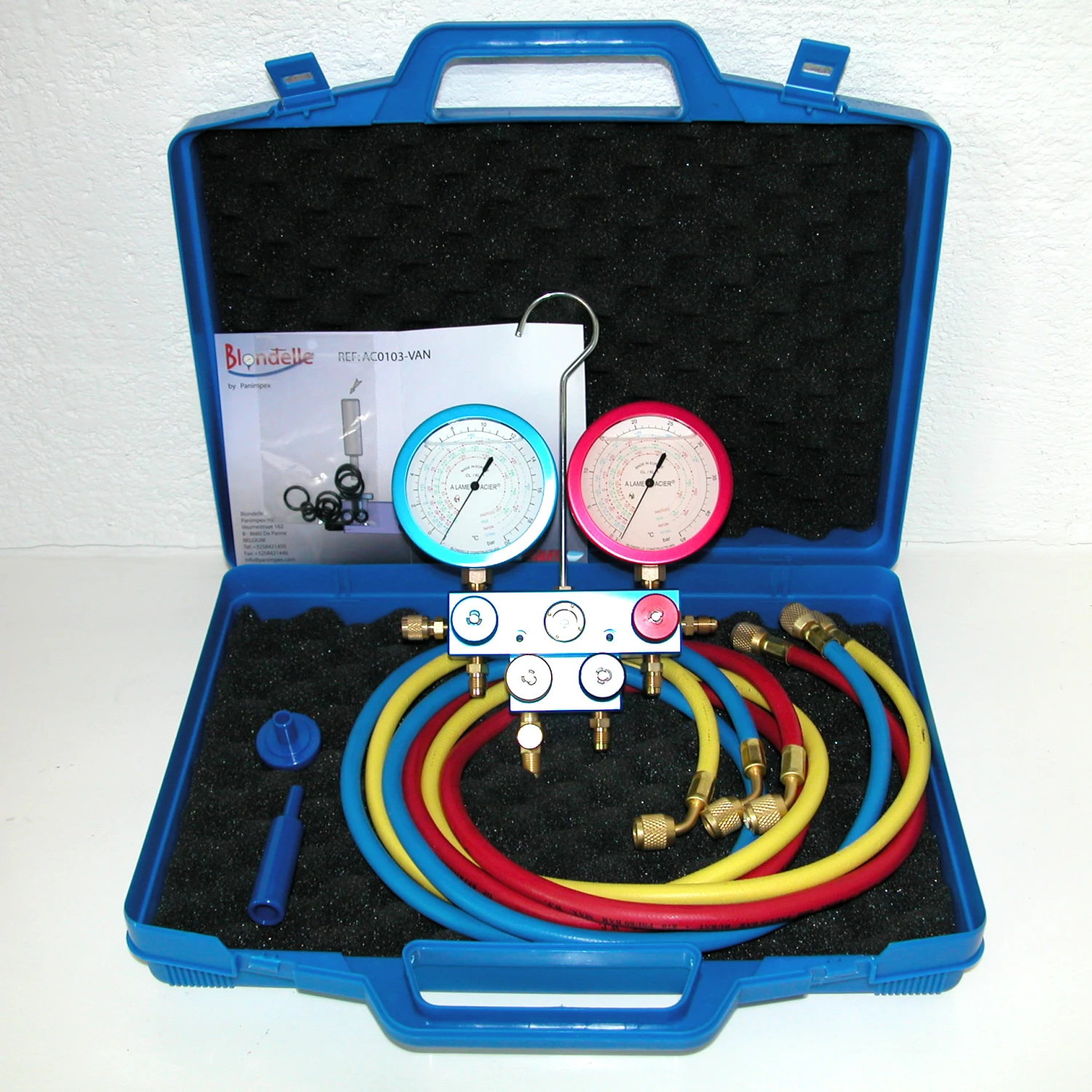 Livré en mallette plastique Comprend jeu de 3 flexibles avec vannes. Kit de remplacement des joint du manifold Manomètres à bain d’huile classe 1.0 diamètre 80 mm.