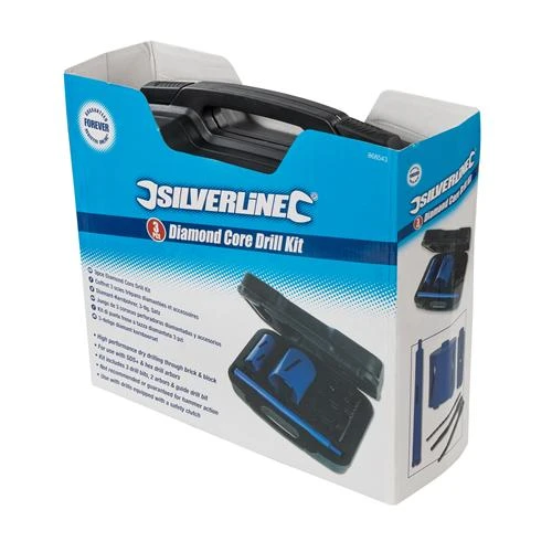 Comprend 3 trépans (28, 52 et 107 mm), 1 porte-trépan SDS Plus, 1 porte-trépan hexagonal ; 1 foret de centrage conique de 10 mm et 1 chasse-cône.
