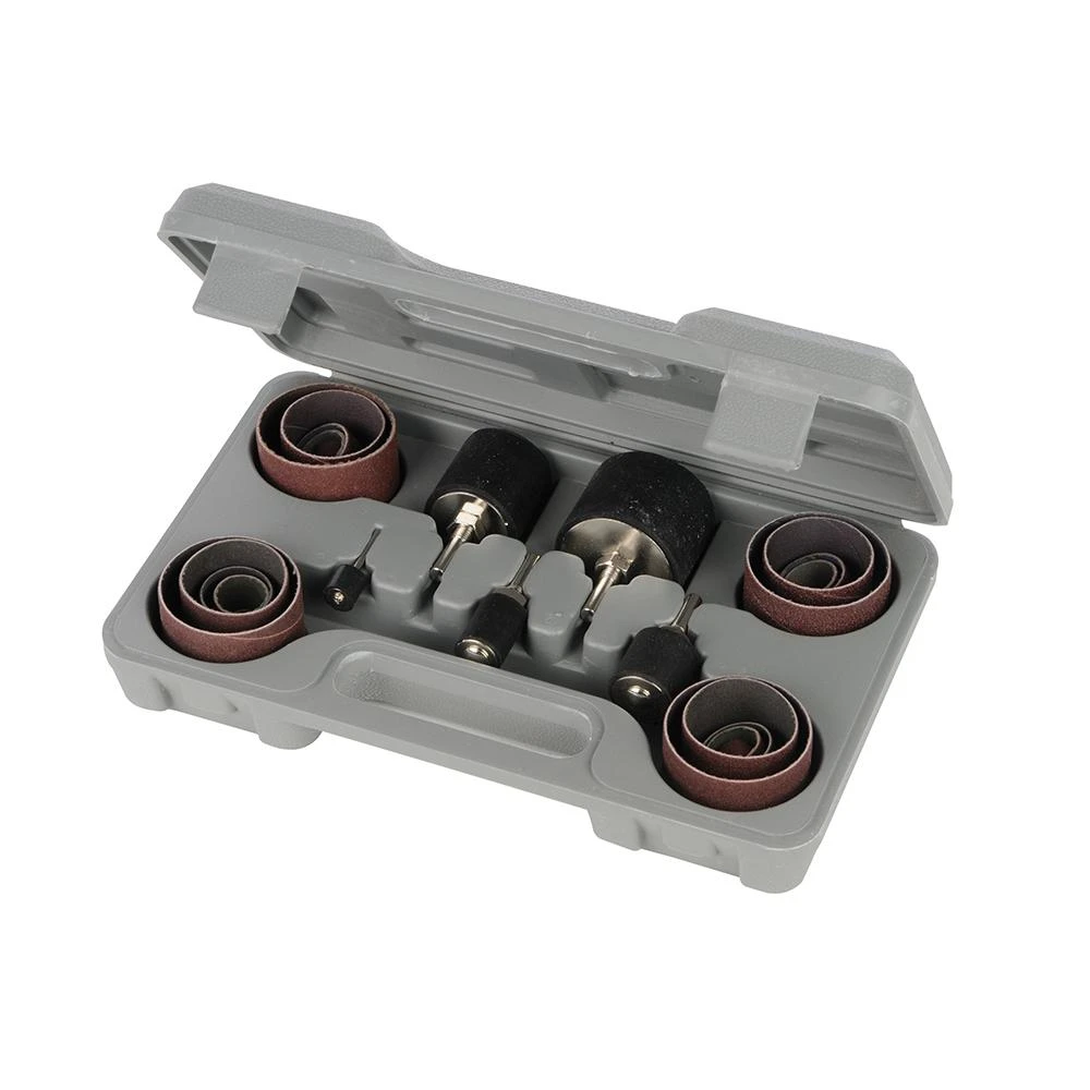 5 tailles – 13, 19, 25, 38 et 50 mm. 20 manchons de ponçage fournis (4 de chaque taille), 5 broches-supports caoutchouc (1 de chaque taille).