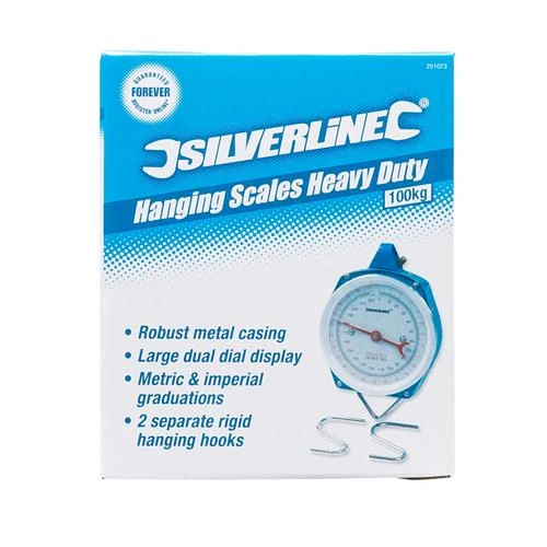 Boîtier métallique robuste avec une finition laquée résistante. Large cadran à double échelle de mesures (métrique et impériale). Tarage simple, idéal pour comparer les poids. 2 crochets de suspension rigides individuels.