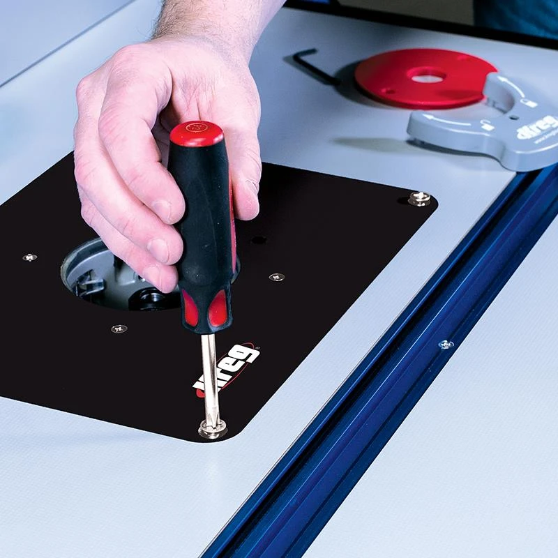 Info : Il existe des insert pour défonceuse sous table pré-percés pour certaines défonceuses. Pour les défonceuse Triton TRA001 et MOF001 vous pourrez opter pour la référence PRS4034 que vous pourrez insérer à la place de la plaque d’insert vierge livrée.