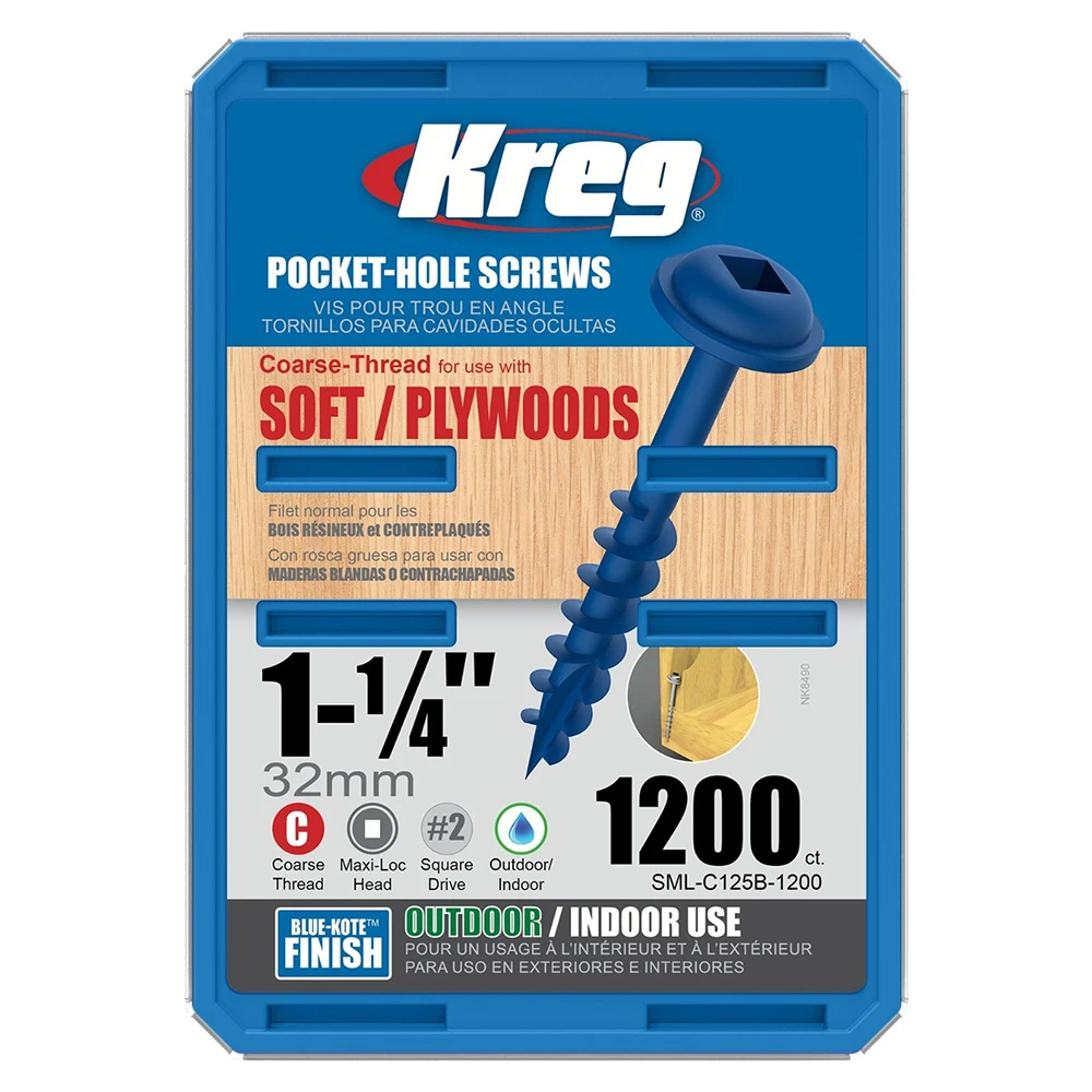 Les vis Kreg Blue Kote on une tête rondelle et un pas de vis grossier. Elles sont adaptées pour l’utilisation avec tous les gabarits de perçage Kreg Jig, à l’exception des gabarits Micro et HD.
