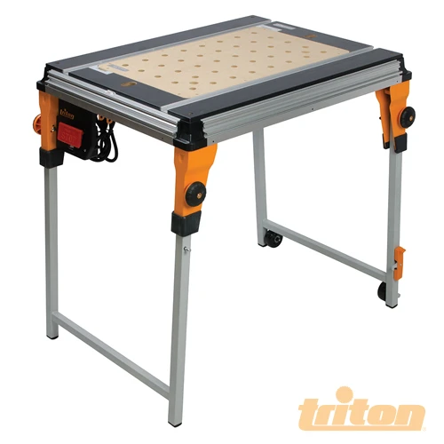 Poste de travail polyvalent compatible avec une large gamme d’accessoires permettant de s’attaquer à tous les types de travaux. Interrupteur principal intégré et prise universelle pour brancher les outils électriques, avec arrêt coup de genou.